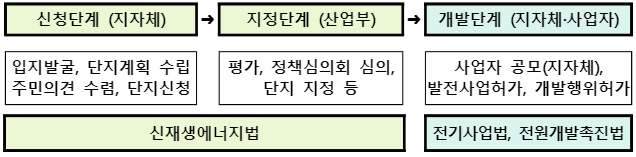 지자체가 입지발굴, 단지계획 수립, 주민수용성 확보 등을 주도적으로 수행하고, 산업부에 집적화단지 지정을 신청하면 평가 후 신재생에너지 정책심의회 심의를 통해 지정하게 된다.