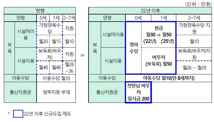 ㅇ 영아수당은 어린이집을 이용할 때 받는 보육료 바우처(0세반 약 50만 원)와 가정양육 시 받는 양육수당(0세 20만 원, 1세 15만 원)을 통합한 수당(0~1세 30만 원)으로,  부모는 본인의 선택에 따라 현금(가정양육 시)으로 수당을 수령하거나, 보육료 바우처(어린이집 이용 시) 또는 종일제 아이돌봄 정부지원금(생후 3개월 이후 종일제 아이돌봄 서비스 이용 시)으로도 수급할 수 있다. 보육료와 아이돌봄 지원금은 30만 원을 초과하여도 전액이 지원된다.