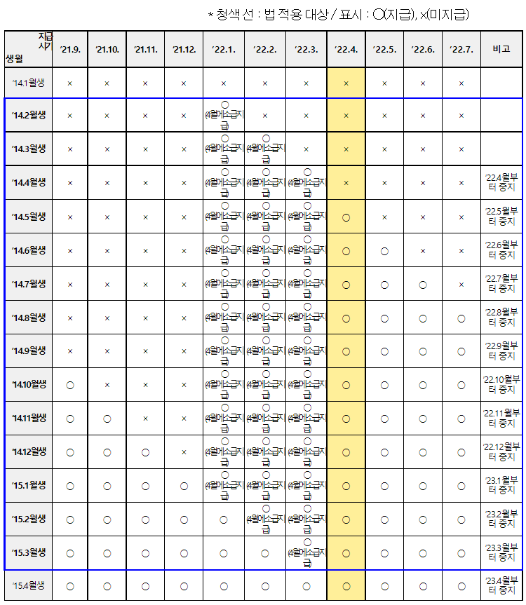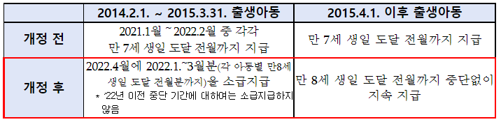 ㅇ 이에 기존에 아동수당을 받다가 만 7세가 되어 이미 지급이 중단되었거나 중단될 아동(2014.2.1.~2015.3.31. 출생아동)에 대해서는 2022년 4월 아동수당 지급 시 2022년 1~3월분을 소급해서 지급*할 예정이다.