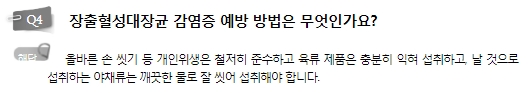 * 비살균 우유, 날 육류 등은 피하고, 소고기는 중심 온도가 72도 이상으로 익혀 먹기