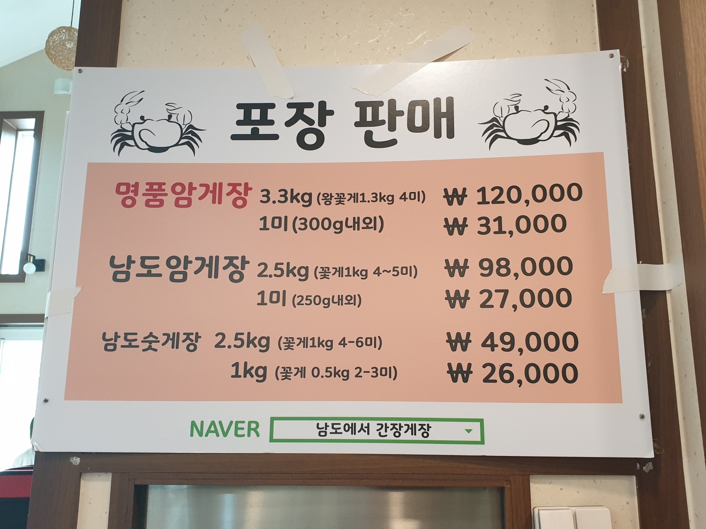 "남도에서"는 포장을 하는 간장게장 요리가 3가지가 있습니다.