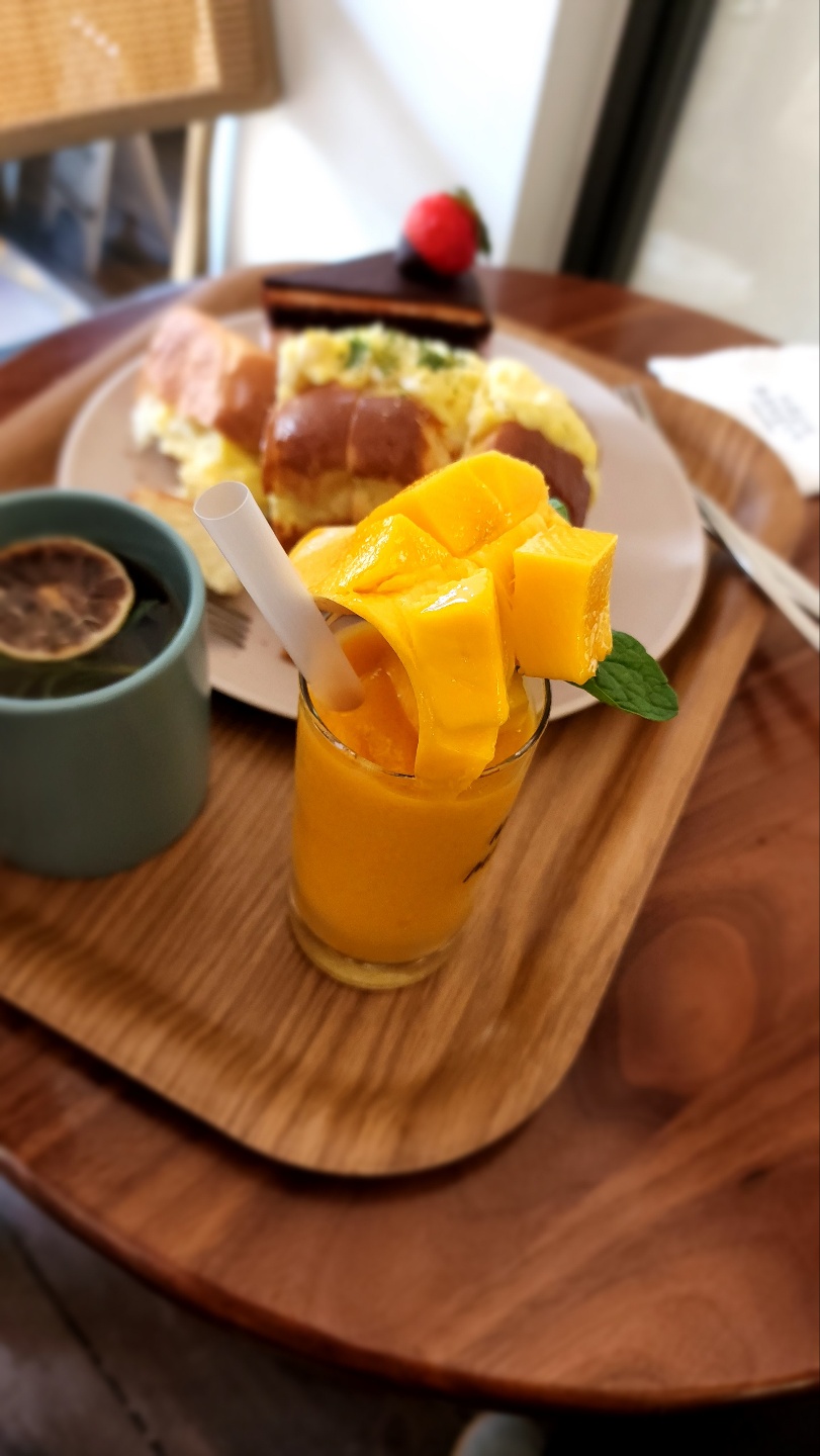 저게 주문한 것은 "쌀초코케이크, 에그샌드위치, 얼그레이, 하우스리얼망고스무디"입니다.