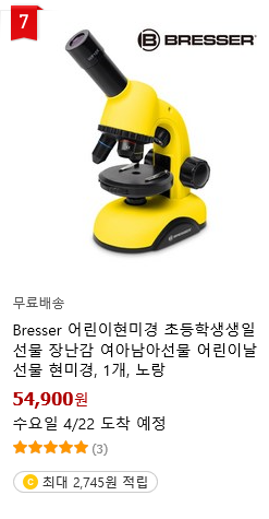 - (왼쪽) 좀 특이한 선물이 상위 링크를 차지했네요. 바로 어린이 현미경입니다. 호기심이 많은 아이들에게 하나 정도 있으면 많은 놀이와 학습에 많은 도움이 될 것 같습니다.