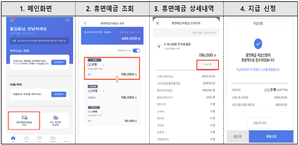 혹시 다른 기능은 또 없을까?” 메인 페이지로 돌아오니 카드 포인트 현금화 옆에 휴면예금/보험금 조회탭이 눈에 들어옵니다. 휴면예금 조회에 동의를 해 보니, 여기에도 내가 모르던 내 재산이 있었네요. 휴면예금 지급 신청도 끝내고 기분 좋게 앱을 종료합니다.