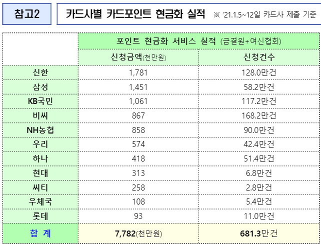 카드포인트 현금화 서비스 시작 후, 연 평균잔액 약 2.4조원의 신용카드포인트에 대해, 7.5일간(1.5(11) ~ 1.12(24)), 서비스 681만건이 신청되어 778억원을 현금으로 돌려드렸으며,