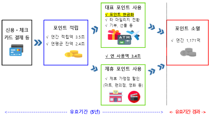* 소멸포인트의 일부는 신용카드사회공헌재단에 기부(연간 50~100억 내외)되어 영세가맹점 지원 등 공익사업에 활용 중이나, 그 규모가 크지 않고 금융소비자가 체감하는 혜택도 미미
