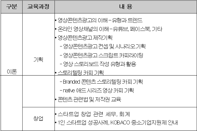 ㅁ 교육생들은 광고 기획부터 촬영, 편집까지 독자적으로 광고 콘텐츠를 제작하는 등 전반적인 광고 제작 과정을 배울 수 있으며, 소자본 1인 창업을 위한 세무, 회계, 중소기업 지원제도 안내 등도 교육 과정에 포함되어 있다.