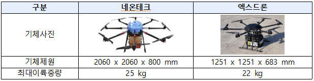 * 공통사항 : 자동이착륙, 최대 풍속저항-비행시 10 m/s 이상, 배달물품 적재장치 탑재, 유상하중(물품 무게) 5 kg, 비가시권비행 10 km, 관제시스템에 드론 위치 표시