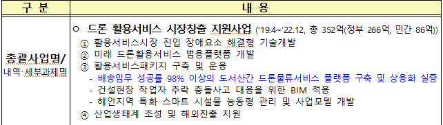 * (주요 과제) 드론 물류서비스 플랫폼 구축 및 상용화 실증, 활용서비스 상용패키지 개발실증, 서비스 핵심 상용기술 개발, 생태계조성 및 수출지원 등 (’19.4. ∼ ’22.12/총 352)