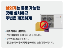 - 또한, 실외기는 밀폐되지 않고 통풍이 잘되는 곳에 설치하고 항상 주변을 깨끗하게 관리하여야 한다.
