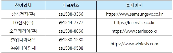 ○ 참여 운동에는 안전한 소비 환경 조성을 위해 ‘가전제품 정례 협의체*’에 소속된 에어컨 제조사**가 대거 참여하여 무상(출장·점검)으로 진행된다.