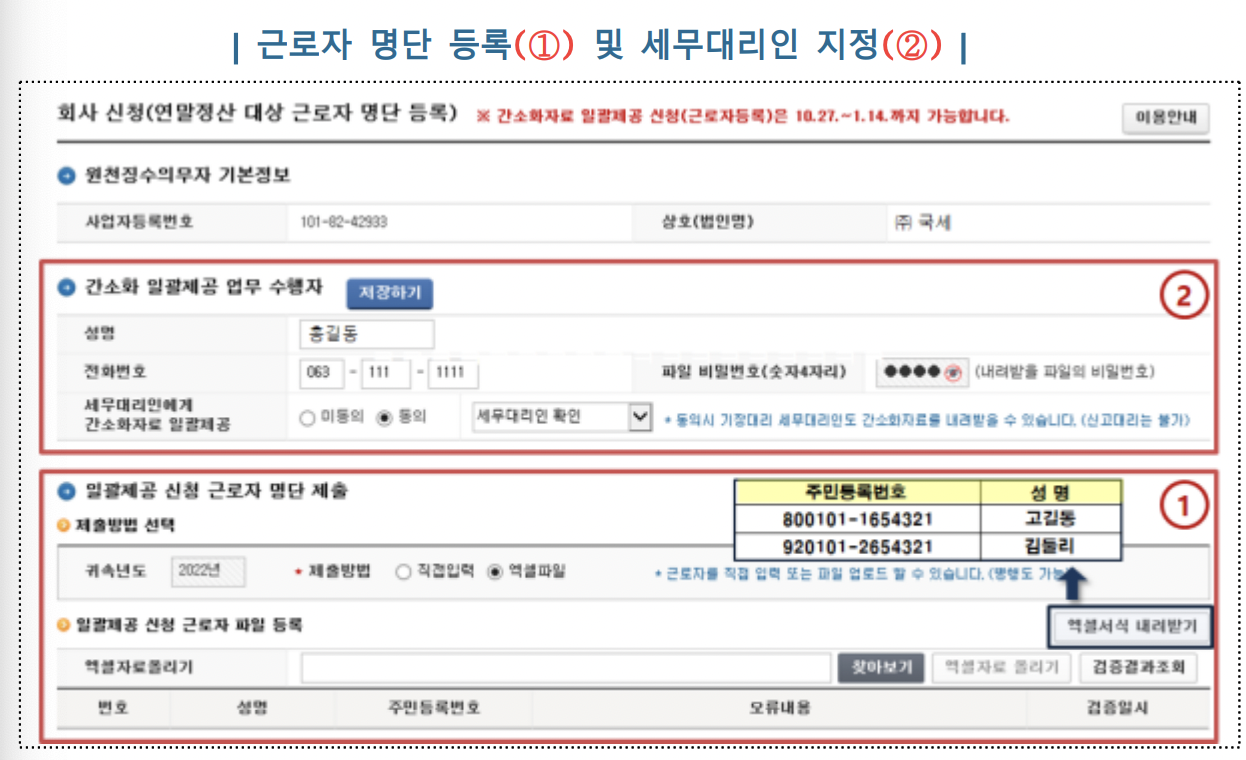 퇴직자, 일용근로자 등 연말정산 대상이 아닌 직원이 등록 명단에 포함되지 않도록 유의해야 합니다.
