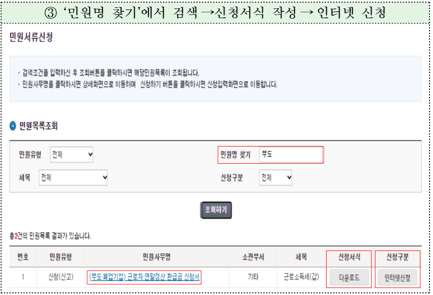 홈택스 접속신청/제출일반신청/제출일반세무서류 신청민원명 찾기에서부도로조회(부도폐업기업)근로자연말정산 환급금 신청서신청서식 내려받기 후 작성인터넷 신청(작성한 신청서식 첨부)