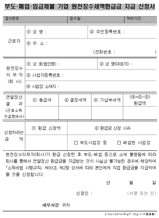부도폐업임금체불 기업 원천징수세액환급금 지급 신청서