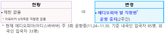 ○ (오미크론 대응방안 : 항공편 제한) 12월 4일 0시부터 나이지리아를 더한 9개국이 많이 유입되는 에티오피아發 직항편(주3회)도 향후 2주간(12월 04일 0시 ~ 12월 17일 24시) 국내 입항을 중단한다. 다만, 아프리카 지역의 유일한 직항편이 일시 중단됨에 따라 정부에서는 우리 국민의 안전한 귀국을 위해 부정기편을 편성할 예정이다.