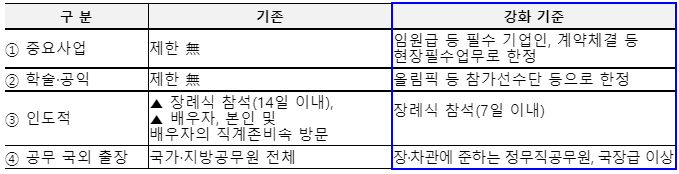 - 향후 2주간(12월 03일 0시 ∼ 12월 16일 24시) 모든 국가에서 입국하는 내외국인은 예방접종여부와 관계없이 10일간 격리를 해야 하며, 강화된 격리면제제도를 적용하여 장례식 참석, 공무 등에 한정하여 격리면제서 발급을 최소화한다. 직계존비속 방문, 기업인 등 기존에 해외예방접종완료자 격리면제서를 발급받았던 경우에도 격리대상에 해당된다.