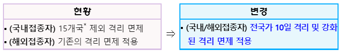 - 구체적으로 내국인, 장기체류외국인은 자가격리 10일을 하며 PCR 검사 3회(사전 PCR, 입국후 1일차, 격리해제전)를 받아야 하며, 단기체류외국인은 임시생활시설 10일 격리를 해야 한다.