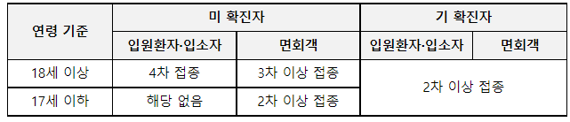 또한 고위험군으로 분류되는 장소이니 만큼 안전한 면회를위해 아래 예방접종 기준을 충족하거나 최근 확진 후 격리해제자에 한해서 접촉 면회가 가능합니다.