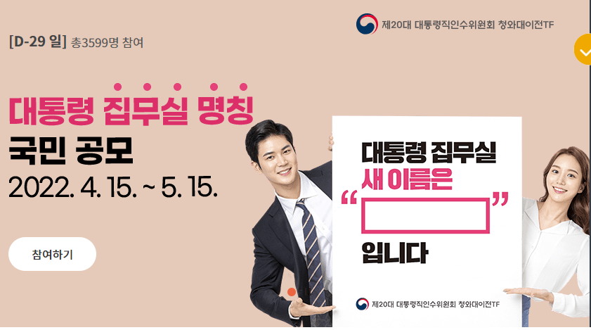 제20대 대통령인수위는 이번에 진행될 용산 대통령 집무실 이전에 있어서 이름 선정에 있어서 대국민 공모전을 공고했습니다. 총상금은 1200만 원이며 5월 15일까지 참여 가능합니다. 용산 대통령 집무실 이름 공모 참여방법은 아래를 참고하시기 바랍니다.