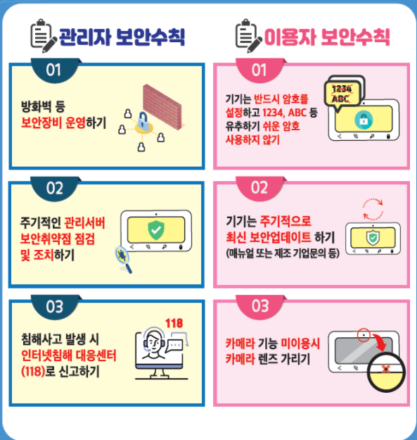 o 기기 이용자는 ⑥ 기기는 반드시 암호를 설정하고 ’1234‘, ’ABC’ 등 유추하기 쉬운 암호 사용하지 않기 ⑦ 기기는 주기적으로 최신 보안 업데이트 하기(매뉴얼 또는 제조 기업 문의 등) ⑧ 카메라 기능 미이용시 카메라 렌즈 가리기 등이다.