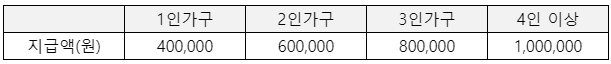 - (위기가구 긴급생계지원 지원금액) 1인 가구 40만 원, 4인 가구 이상 100만 원