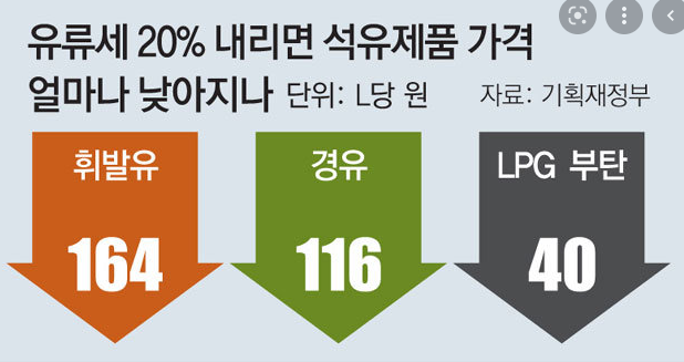 - 휘발류 : (현행 20%) 164원 -> (30% 인하) 247원