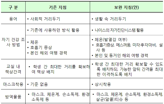ㅇ 이번 지침에는 등교 수업을 대비해, 등교 1주일 전부터 학생들에게 개인위생 및 예방수칙, 의심 증상 시 대처요령을 원격으로 교육하도록 하였고,