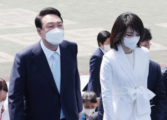 윤석열 대통령은 김건희 여사와 함께 국회에서 열린 제20대 대통령 취임식에 입장하면서 2명의 어린이로부터 꽃다발을 전달받았으며, 연단까지 180m 거리를 국민들과 주먹을 부딪치며 입장하였습니다.