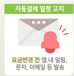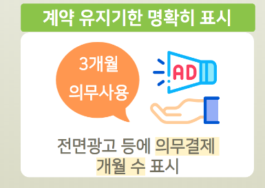 또한, 부당한 자동결제를 방지하기 위해 판촉 행사(이벤트 등) 종료 등 요금변경 전 결제예정 내역을 이용자에게 응용프로그램(앱) 내 알림, 문자, 이메일 등으로 사전 고지하도록 했다. 전면광고 등에 계약 유지기한, 의무결제 개월 수도 명확히 표시하도록 하고, 청약철회 등 중요 내용을 고지할 때도 부호, 색채, 굵고 큰 문자 등으로 명확하게 표시하도록 했다.