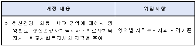 ○ 이는 「사회복지사업법」 개정(법률 제15887호, ’18.12.11. 공포, ’20.12.12. 시행)으로 민간단체에서 운영하던 ‘의료사회복지사, 학교사회복지사 자격’을 국가자격으로 발급할 수 있게 됨에 따라 법률에서 위임한 사항을 구체적으로 정하려는 것이다.