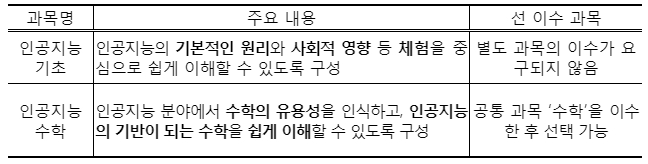◈ 고등학교 ‘인공지능 기초’, ‘인공지능 수학’ 과목 신설, 내년 2학기부터 선택 가능