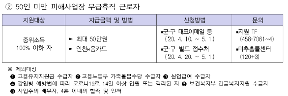 - 제외대상 : 고용유지 지원금 수급자, 고용노동부 가족돌봄수당 수급자, 실업급여 수급자, 감염병 예방법에 따라 코로나 19 14일 이상 입원 또는 격리된 자, 보건복지부 긴급복지지원 수급자, 사업주의 배우자 / 4촌 이내의 혈족 및 인척