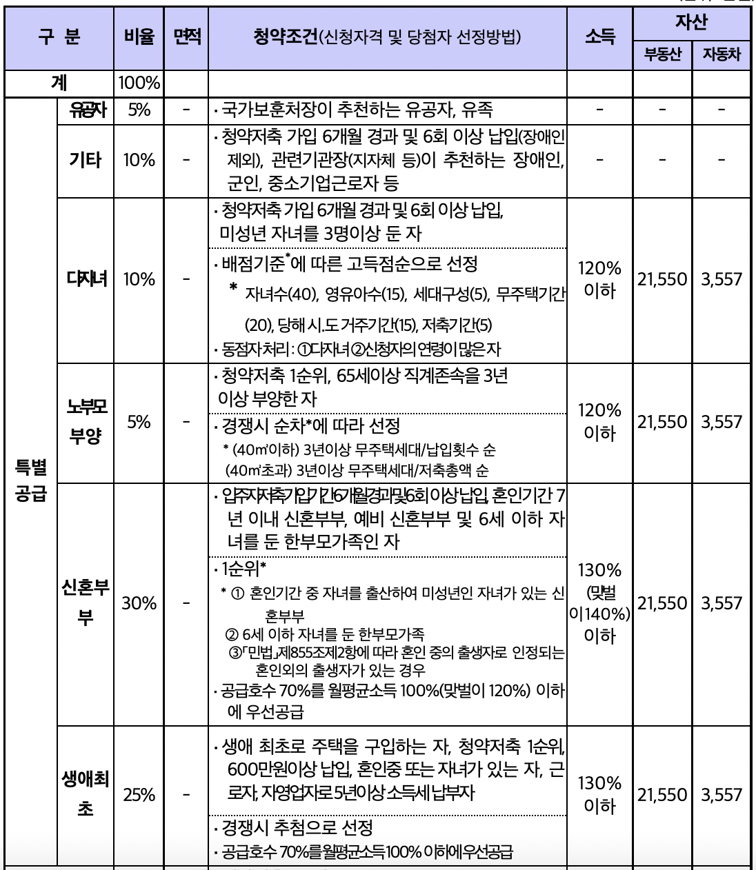 - 또한 일반공급(15%), 특별공급(85%) 등에 따라 입주자저축 가입, 소득-자산요건, 무주택 세대구성원 등을 갖추어야 신청이 가능합니다.