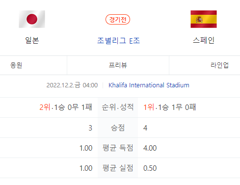 일본, 스페인 경기는 12월 2일(금) 새벽 4:00에 진행됩니다.