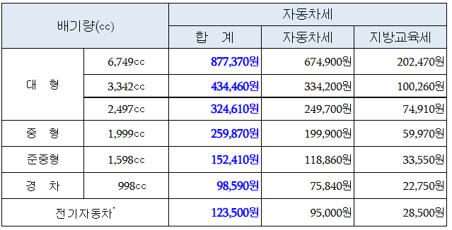 배기량별 자동차세 부과액 예시(비영업용, 신차 기준)