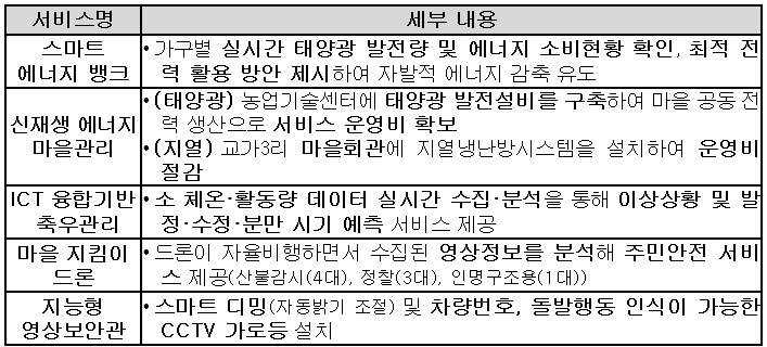 ㅇ 지난해에는 강원도(삼척시 근덕면)과 무안군(무안읍)을 선정하여 ‘ICT 융합기반 축우관리’, ‘드론 기반 정밀 농업’, ‘태양광 안내판 지역정보’, ‘지능형 영상보안관’, ‘양방향 소통 어르신 돌봄’ 및 ‘스마트 쓰레기통’ 등 10개의 서비스를 개발‧보급한 바 있다.