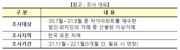 이번 조사는 ’20년 7월부터 ’21년 9월까지 1억원 이하 저가아파트를 매수한 법인․외지인의 거래에 대해 자금조달계획, 매도․매수인, 거래가격 등을 종합검토하여 이상거래를 선별하여 실시할 계획입니다.