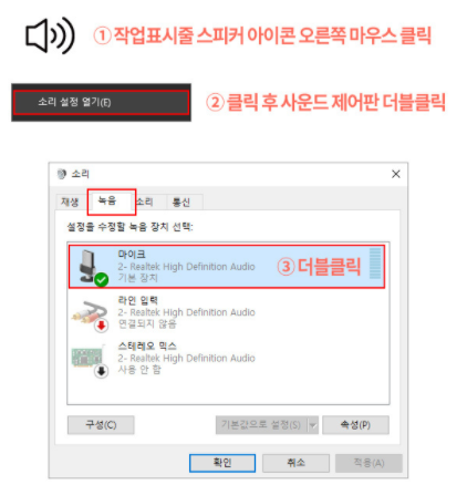 - 작업표시줄 오른쪽 하단의 스피커 아이콘 오른쪽 마우스 클릭 후 -> 소리 설정 열기 -> 사운드 제어판 -> 녹음 탭 -> 마이크 선택 -> 기본값으로 설정