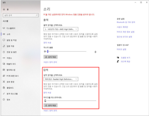정상적으로 작동되는지 확인 여부는 소리 창의 입력 부분에서 마이크 테스트를 하시면 됩니다. 정상적으로 작동하는 경우 테스트 바가 오르락내리락하면 마이크는 정상 제품입니다.