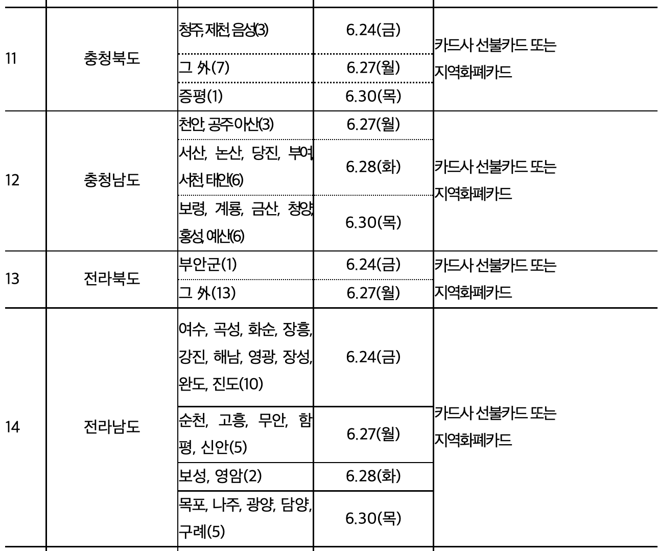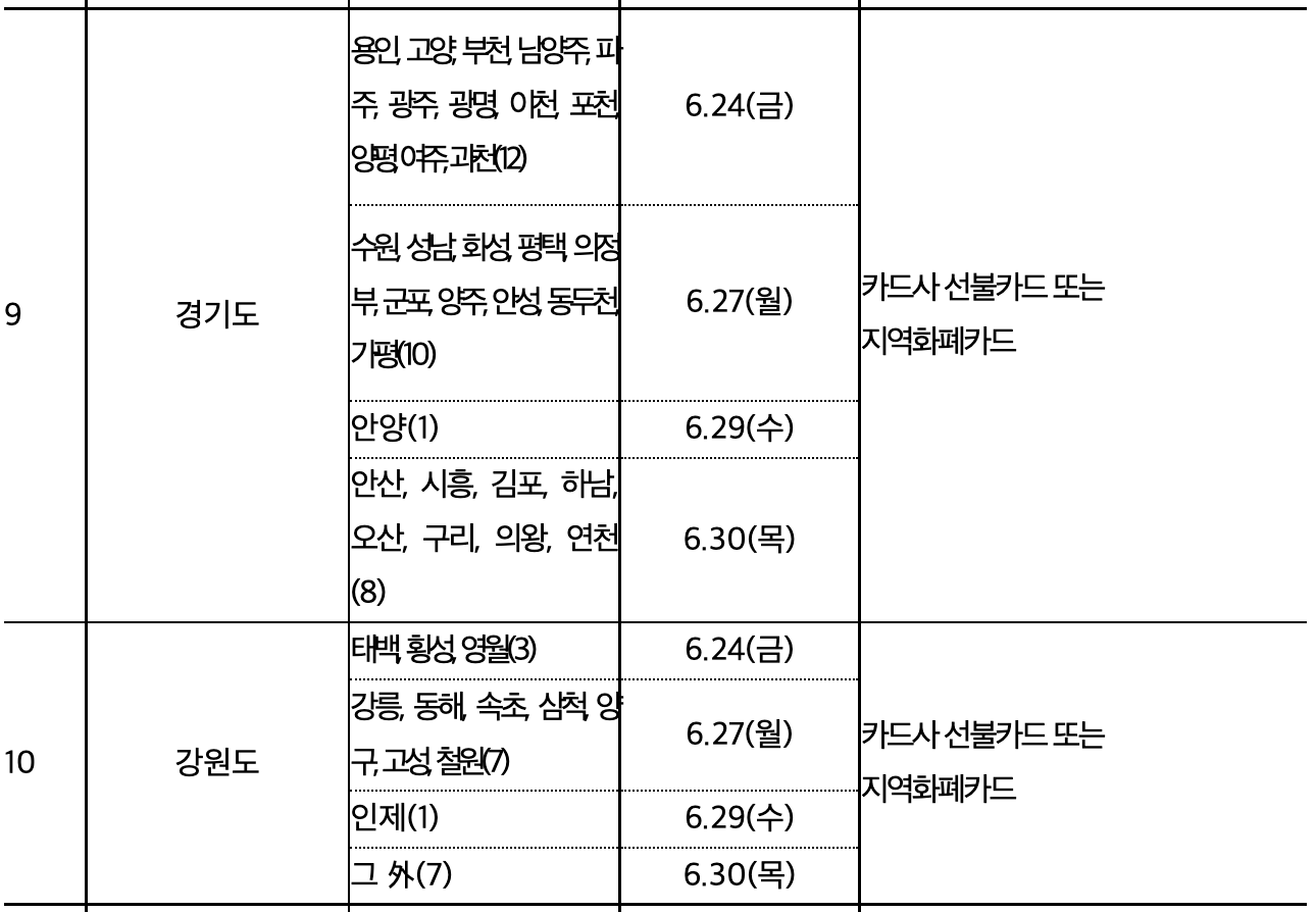 부상, 대구, 세종 등은 6월 24일(금) 지급을 최초로 시작하며 서울, 대전, 울산, 제주는 6월 27일(월)부터 지급하는 등 나머지 지역도 모두 6월 중으로 지원을 시작합니다.