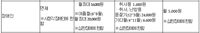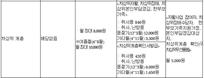 * 기초생활수급자, 차상위계층(한부모가족 포함), 장애인, 보훈대상자, 다자녀가구, 대가족, 출산가구
