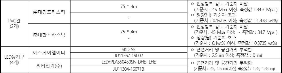 ㅇ (PVC관, 고령자 용품: 4개 제품*) 인장강도 기준치 미달 및 납 정량 기준치를 초과한 PVC관 2개, 경사지 밀림 방지 기준(10°)에 부적합한 고령자용 보행차 2개