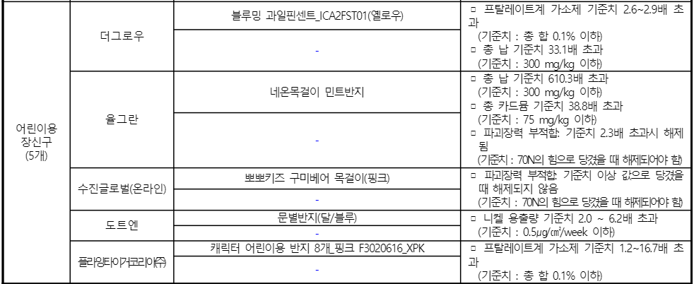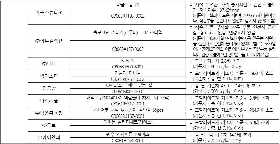 ㅇ (완구/장신구: 15개 제품*) 프탈레이트계 가소제 기준치를 최대 382배 초과한 어린이 완구류 4개, 납 기준치를 최대 145배 초과한 완구 3개 및 610배 초과한 장신구 1개, 자석 및 작은 부품 기준에 부적합한 완구 각 1개 등