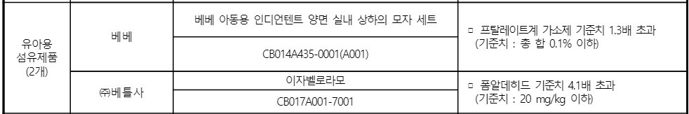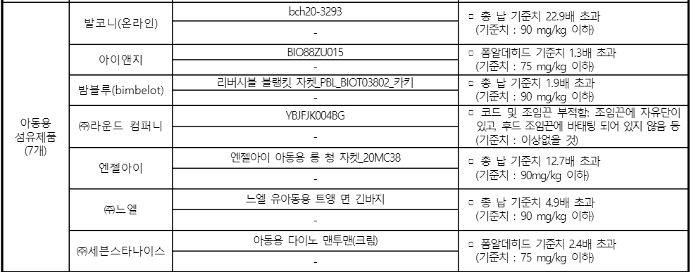 ㅇ (유아용 의류/가죽제품 등: 11개 제품*) 피부장애, 호흡기 장애 등을 유발하는 폼알데히드 기준치를 최대 4배 초과한 유아․어린이 의류 3개, 끼임사고 방지를 위한 조임끈 안전기준을 위반한 어린이 후드 점퍼 1개 , 납 기준치를 최대 35배 초과한 어린이 가죽신발 1개 등