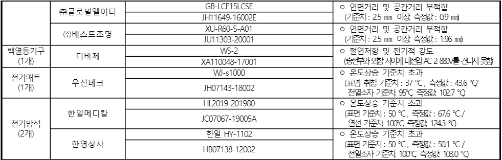 * 전기요, 온수매트, 어린이용 가구 등 적발된 제품