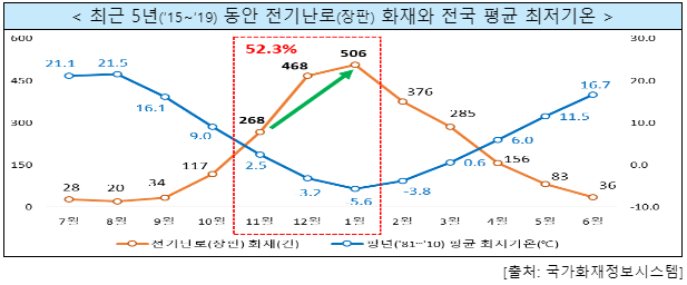 이는 겨울철로 접어들수록 전기장판(난로) 사용이 늘어나고, 이로 인한 화재는 증가하기 때문입니다.