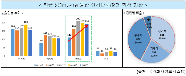 ※ 부주의 36.9%(877건), 전기적 요인 35.0%(831건), 기계적 요인 22.6%(538건)