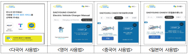 또한, 서울시가 직접 설치한 충전기에는 외국인들도 간편하게 충전기를 이용할 수 있도록 다국어(영어, 일어, 중국어)로 서비스를 제공합니다.