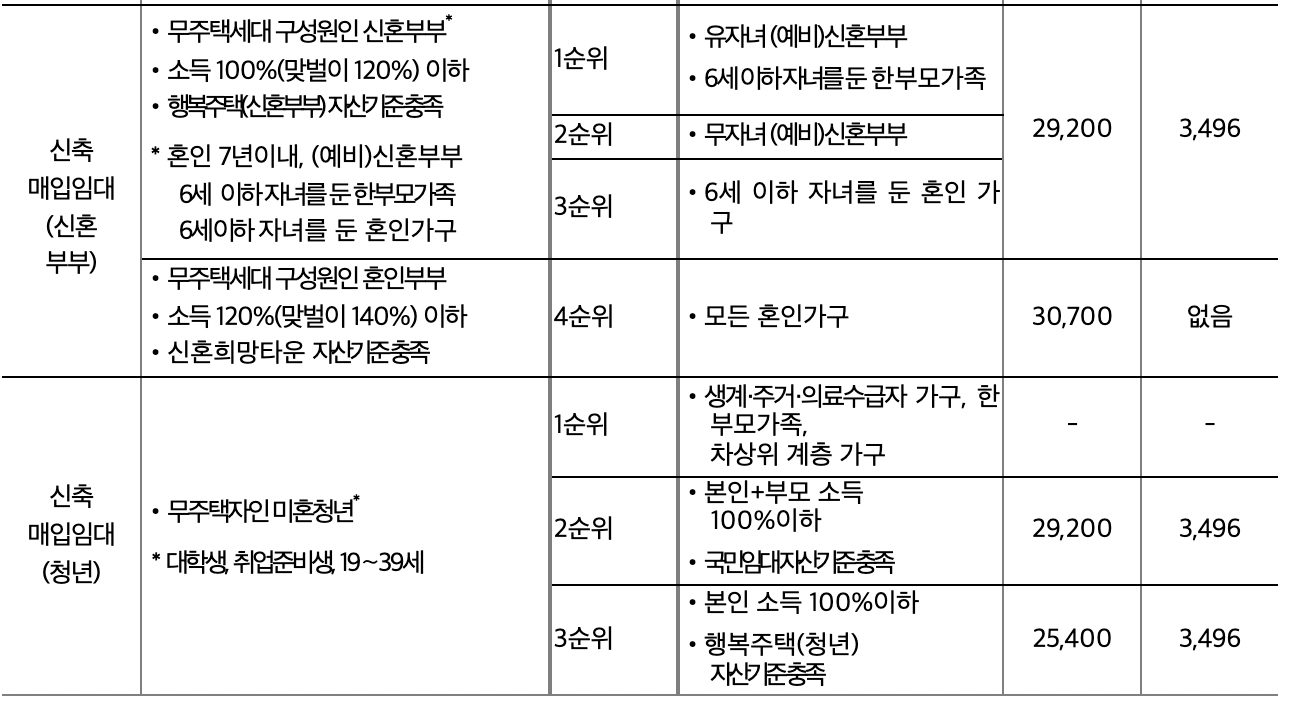 ㅇ 신혼부부용 신축 매입임대주택은 민간의 신축 오피스텔 등을 LH가 매입하여 시세 80% 이하 저렴한 임대료로 공급하는 것으로 일정 소득·자산 기준*을 만족하는 무주택 신혼부부 등이 최대 10년(기본 6년, 자녀가 있는 경우 4년 추가연장 가능)간 거주할 수 있다.