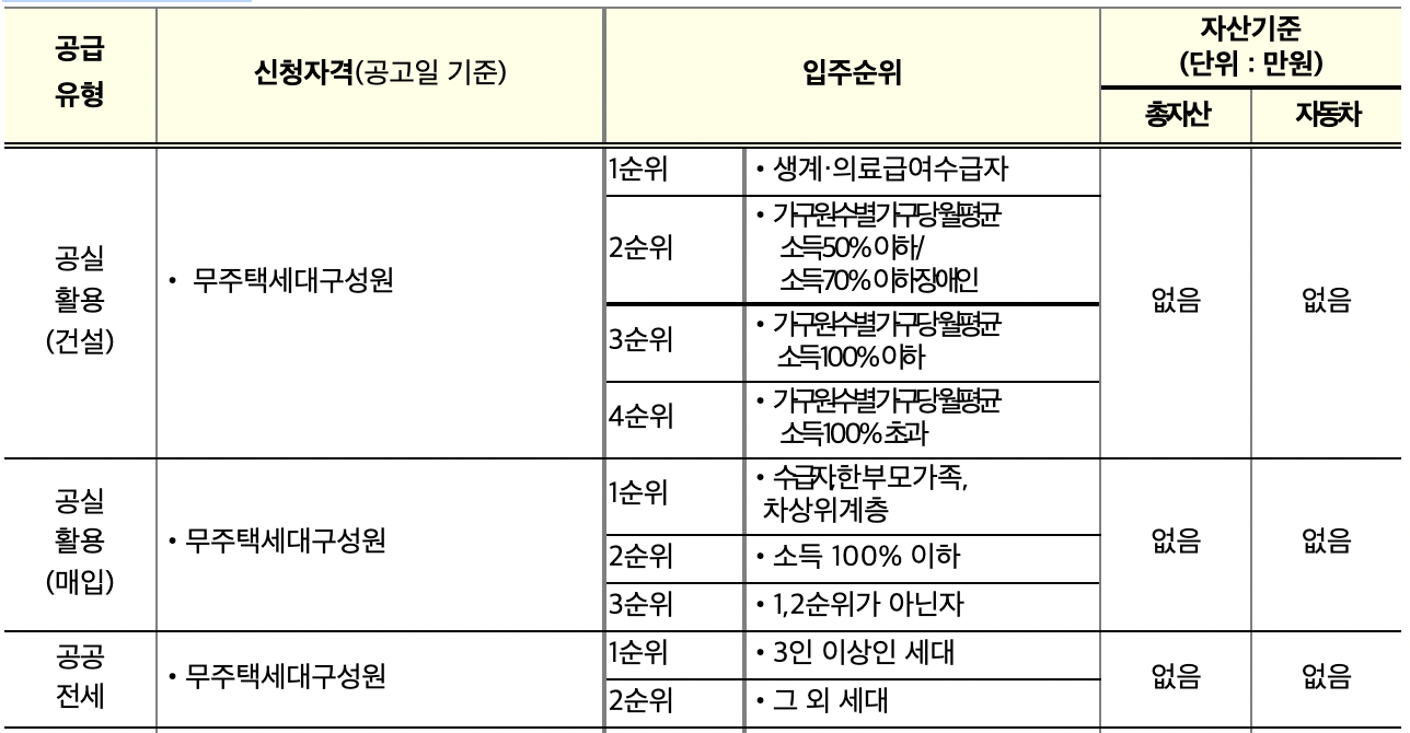 * 다만, 저소득층 입주기회 확보를 위해 경쟁 발생 시 소득 수준에 따라 순위별 입주